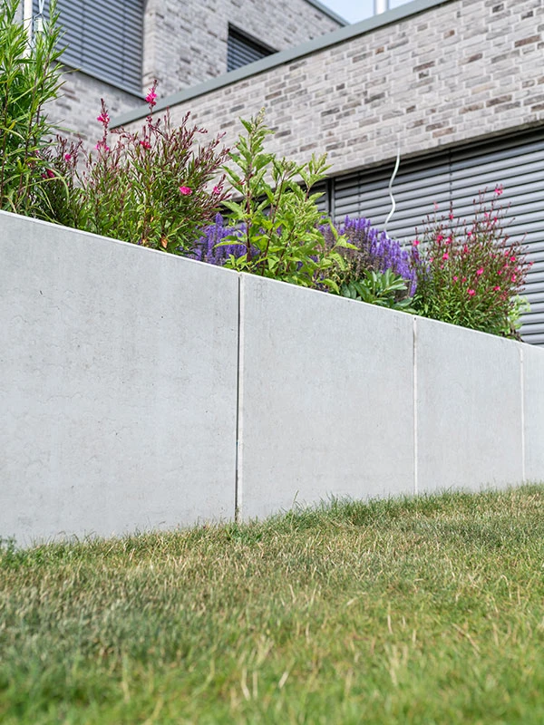 Die bewehrten L-Steine sind in Höhen von 55 cm bis 205 cm und ausschließlich in einer Baulänge von 100 cm erhältlich. Zudem sind passende zweiteilige Ecken verfügbar, die eine flexible Gestaltung ermöglichen.