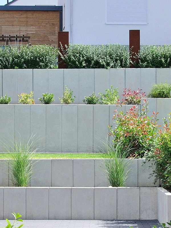 - Ästhetisches Design: Der klassische Beton-Look in Grau oder Anthrazit verleiht Ihrem Garten eine moderne, zeitlose Optik.