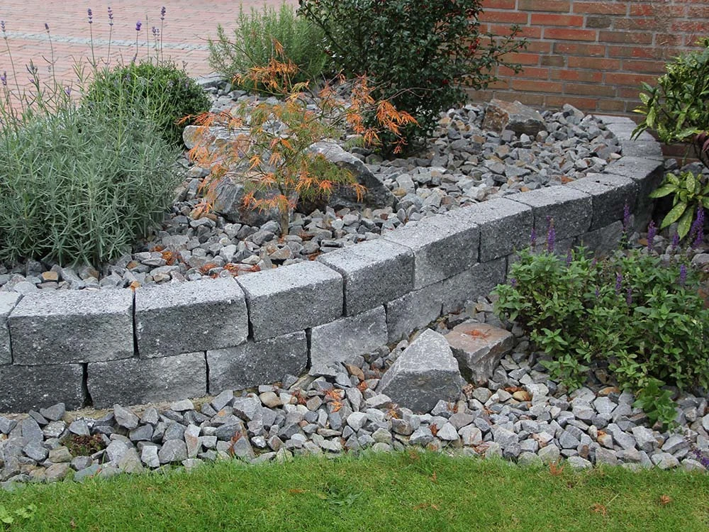 Durch seine gespaltene Oberfläche wirkt der Siola Mini besonders natürlich und fügt sich harmonisch in jede Gartenlandschaft ein. Als Trockenmauerstein kann er ohne aufwendiges Verkleben verarbeitet werden, was eine schnelle und flexible Montage ermöglicht.