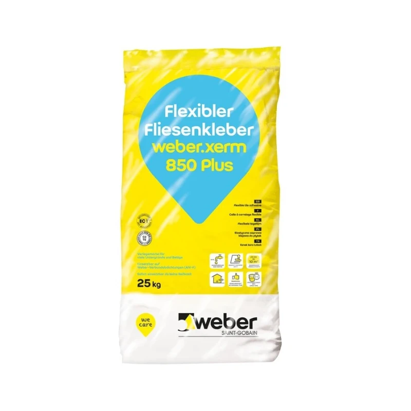 Der weber.xerm 850 Plus eignet sich zum Verlegen von keramischen Wand- und Bodenbelägen im gesamten Innenbereich sowie im Wandbereich außen. Vorwiegend einsetzbar für alle gängigen Fliesen sowie für verfärbungsunempfindliche Natursteine. Der flexible Fliesenkleber kann sowohl als Dünnbett- als auch als Mittelbettkleber eingesetzt werden und ermöglicht das Arbeiten im System auf Weber Verbundabdichtungen aus weber.tec 822, 824, 825, sowie weber.xerm 844. Somit ist das Verlegen in Feucht, Nass- und Kühlräumen möglich. Des Weiteren ist der weber.xerm 850 Plus u.a. auf Untergründen aus Hartschaumplatten einsetzbar.